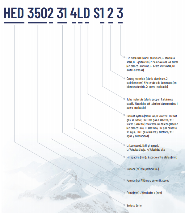 •In models with electric defrost, stainless steel electric heaters covered by aluminum tubes are used, located in the finned package to avoid steam problems and make easy replacement.